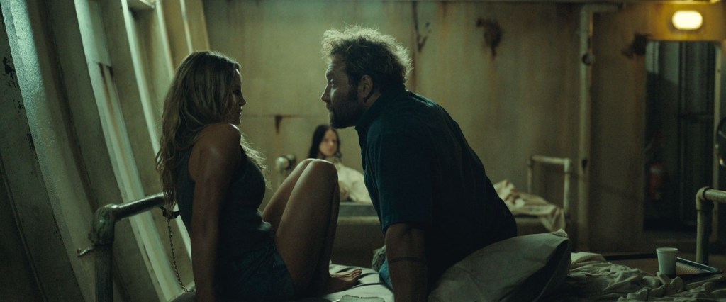 La mise en place est engageante. Sur la Gold Coast australienne, deux touristes embarquent pour une sortie en mer orchestrée par Tucker, un capitaine aussi souriant qu’inquiétant, interprété avec jubilation par Jai Courtney. Ancienne victime d’une attaque de requin, ce dernier est devenu une sorte de prêtre sacrificiel des abysses, livrant des jeunes femmes à ses « dieux » aquatiques sous l’œil froid de sa caméra. La première partie du film, tendue et bien rythmée, laisse entrevoir un spectacle décalé et cruel, à la croisée de Jaws et The Texas Chainsaw Massacre, avec un soupçon de Hostel marin.